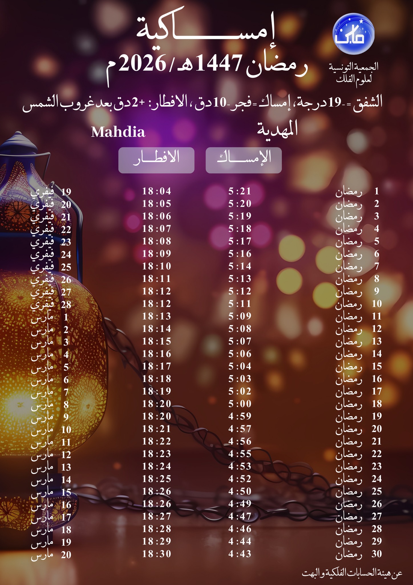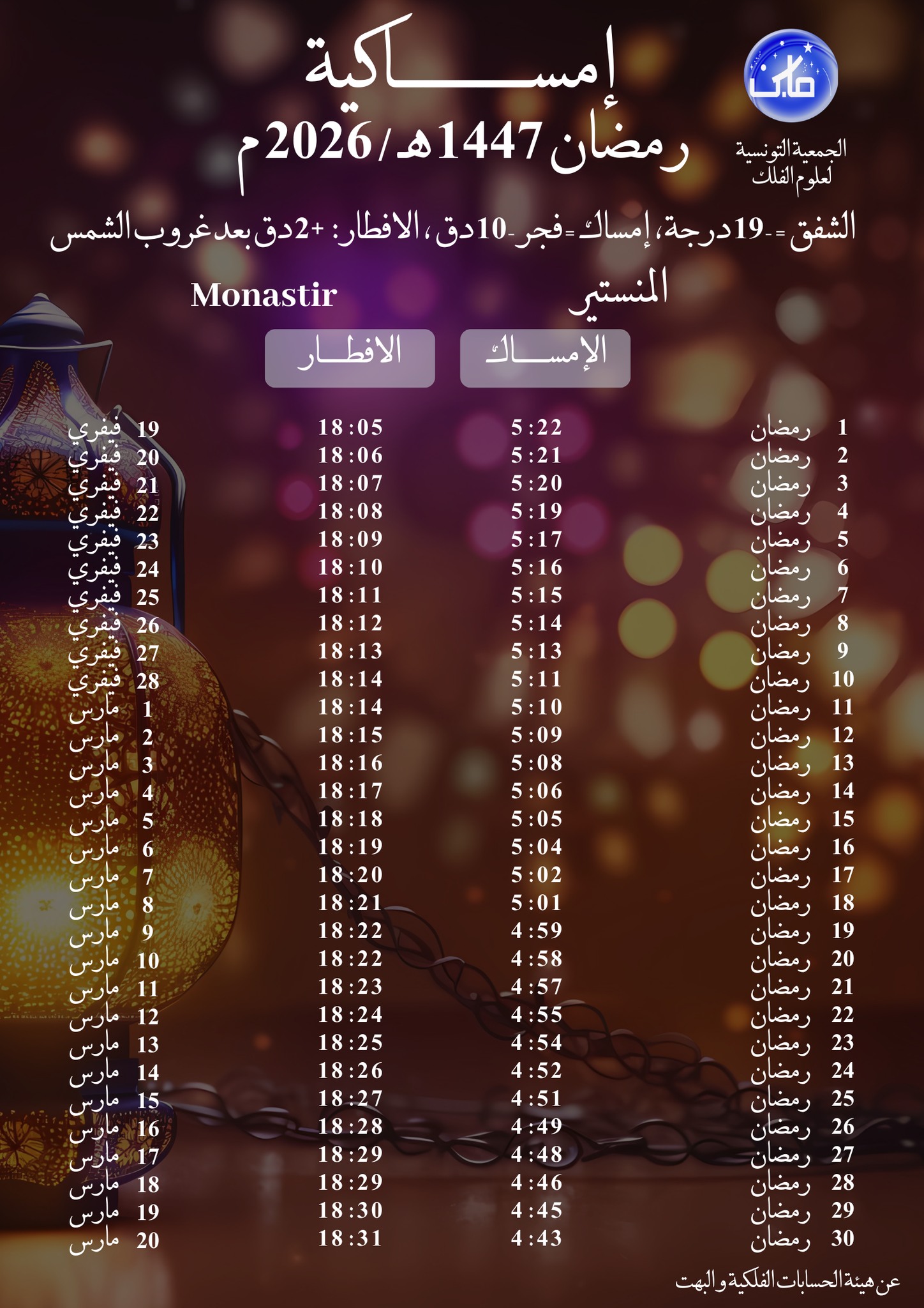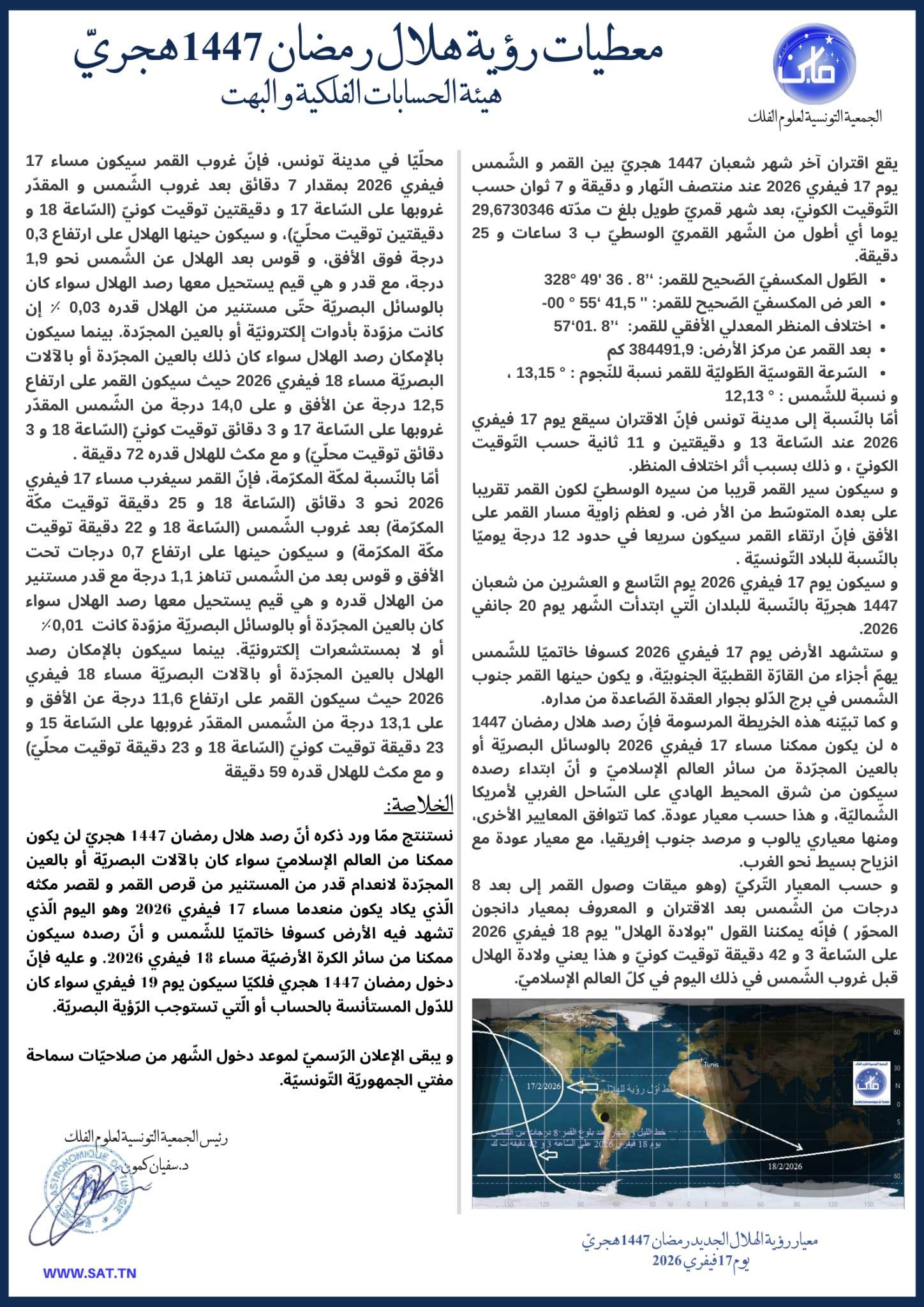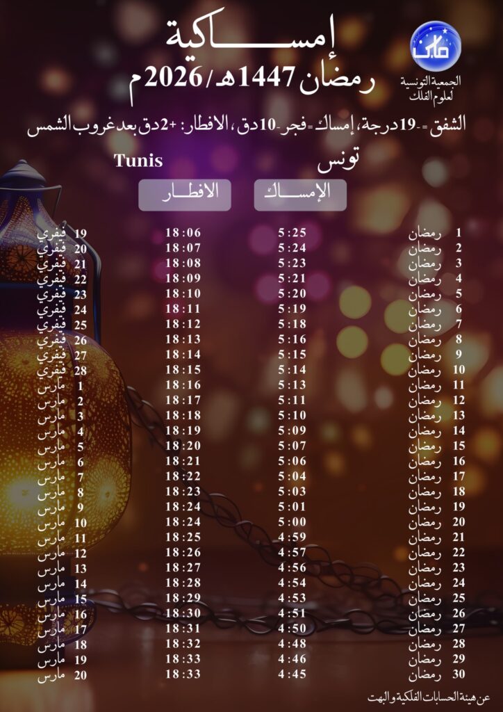 2026 فيما يلي الأحداث الفلكية، بتوقيت تونس، لشهر فيفري Voici les événements astronomiques du mois de février 2026 en heure tunisienne (GMT+1) : 01/02/2026 22h09 PLEINE LUNE 10/02/2026 16h52 Lune à l’apogée Distance géocentrique = …